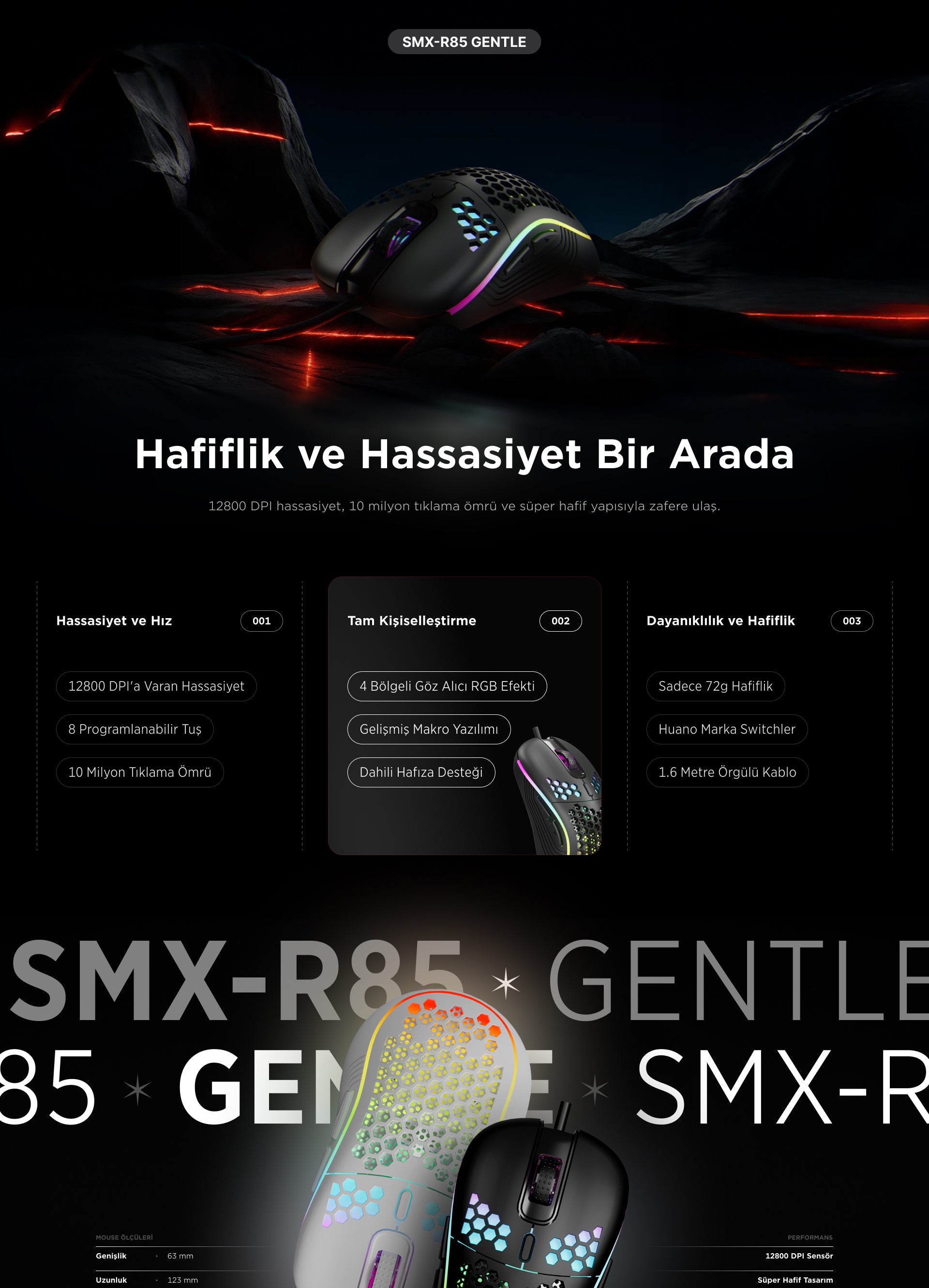 Smx-R85 Gentle 12800 Dpi RGB Süper Hafif Makrolu Oyuncu Mouse-Siyah