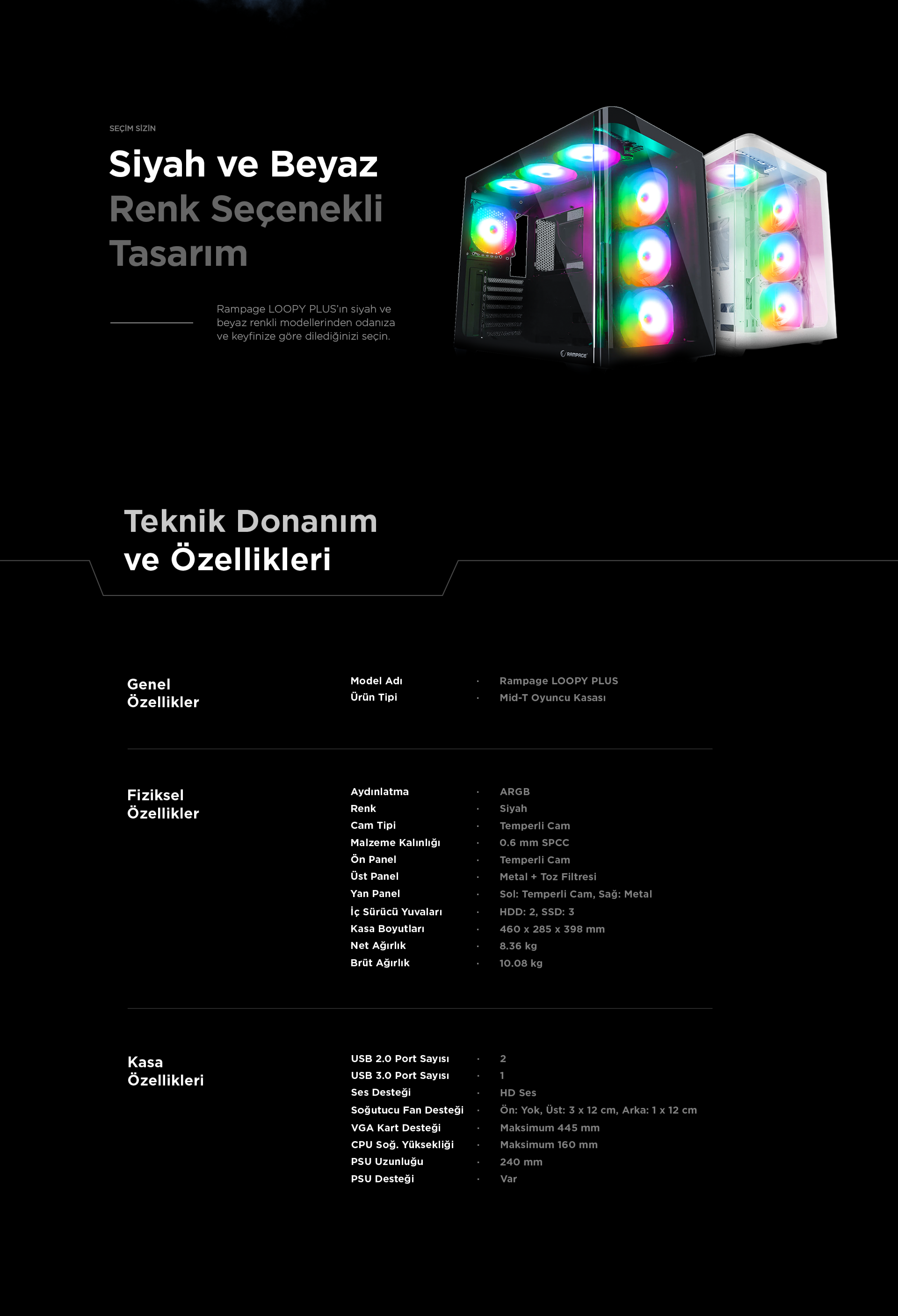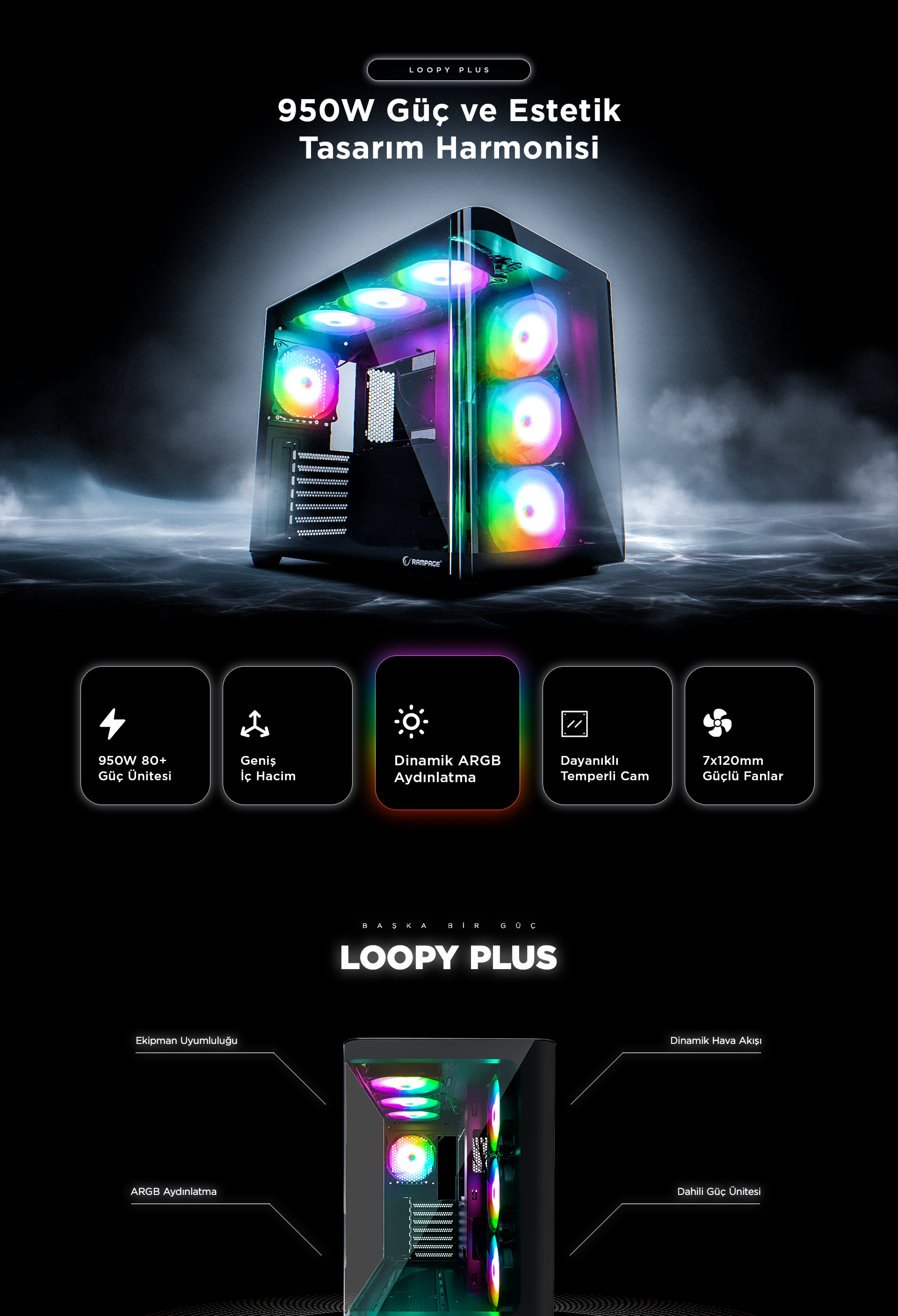 Loopy Plus 950W 80 Plus 7x12cm ARGB Fan Kumandalı Atx Mid-T Oyuncu Kasası-Siyah