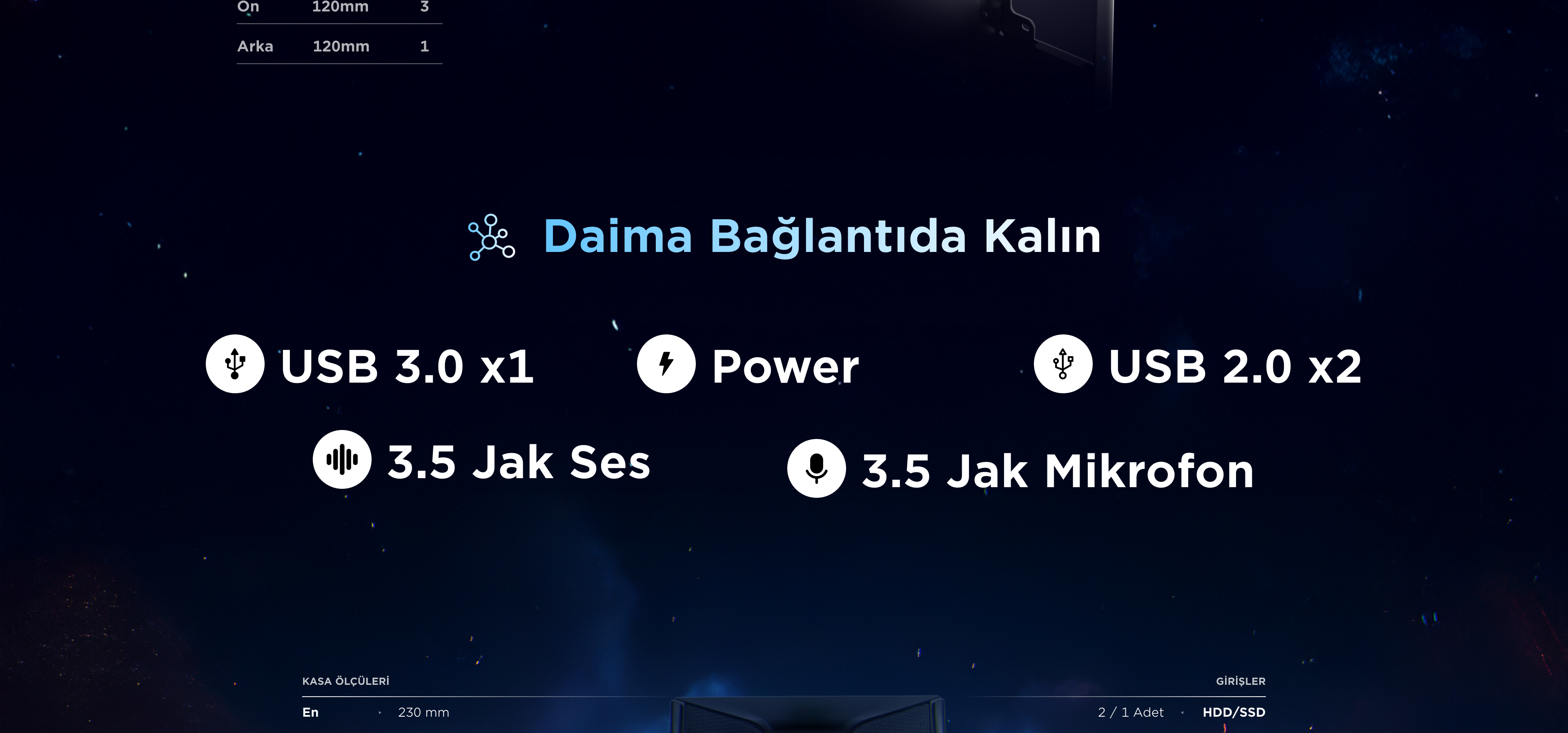 - 1xUsb 3.0 - 2xUsb 2.0 - 2 x AUX 3.5mm Çıkışlar