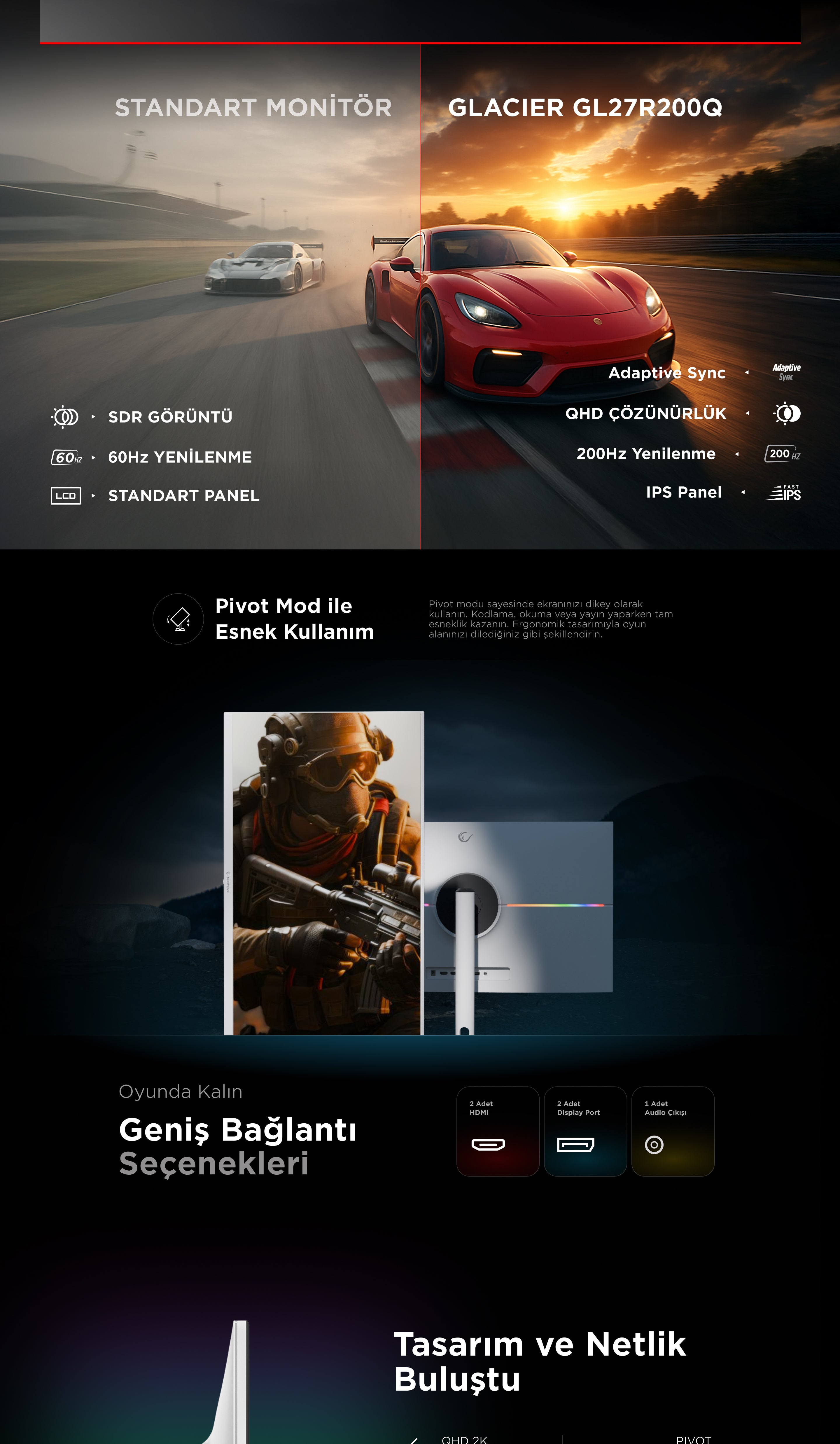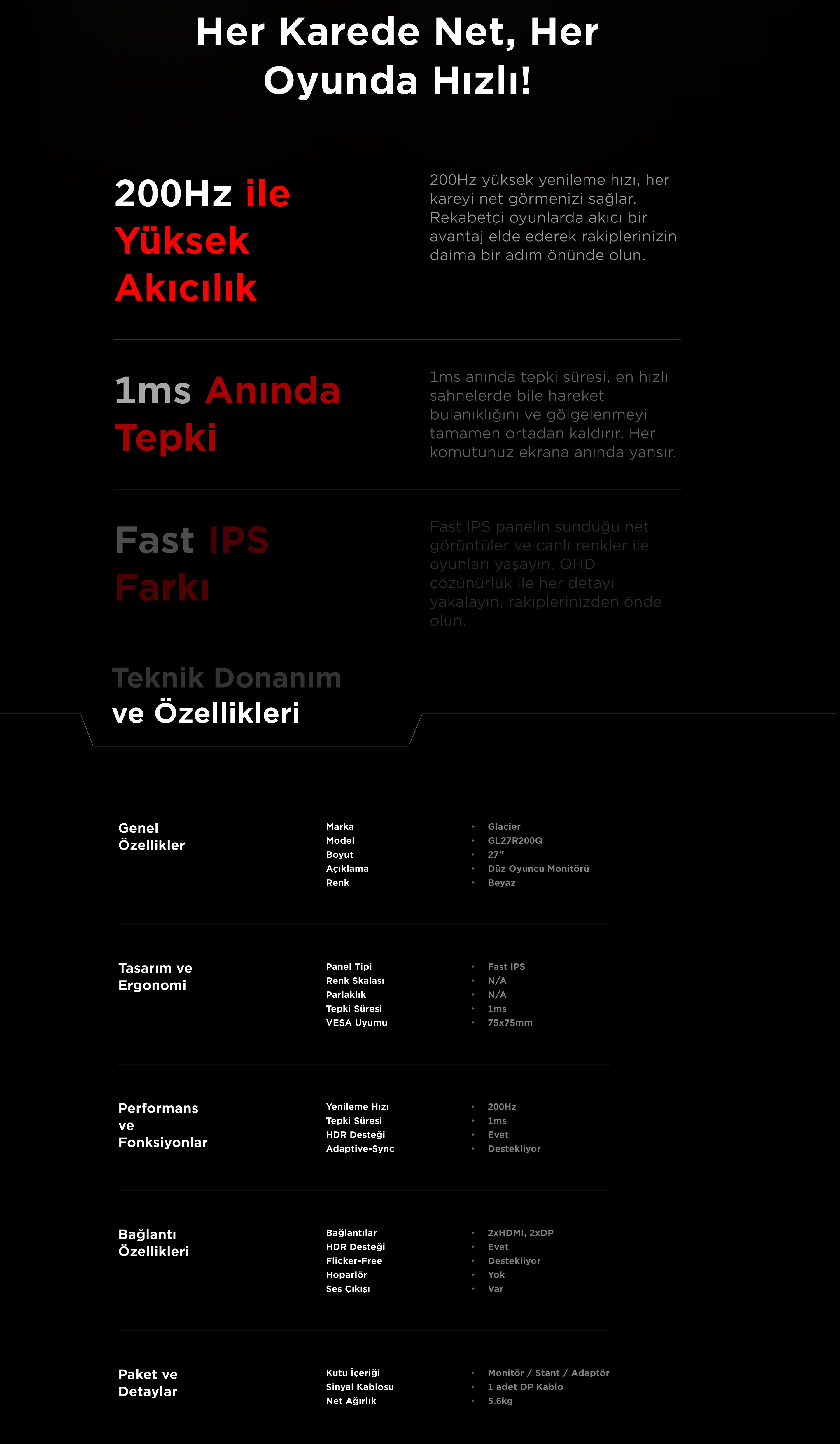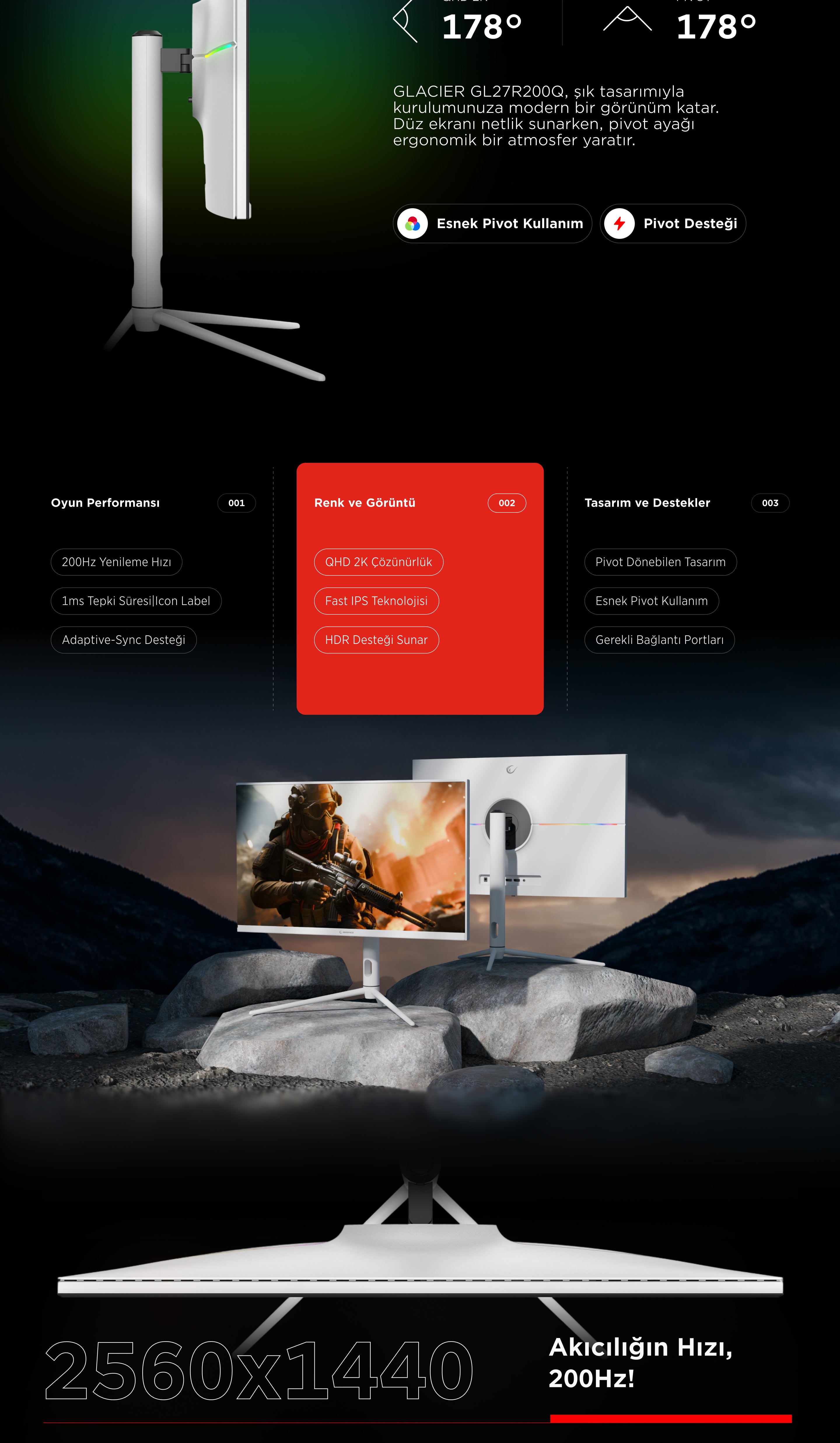 Glacier GL27R200Q 27'' 200Hz 1ms Fast IPS QHD 2K AdaptiveSync RGB Pivot Flat Gaming Monitor-White