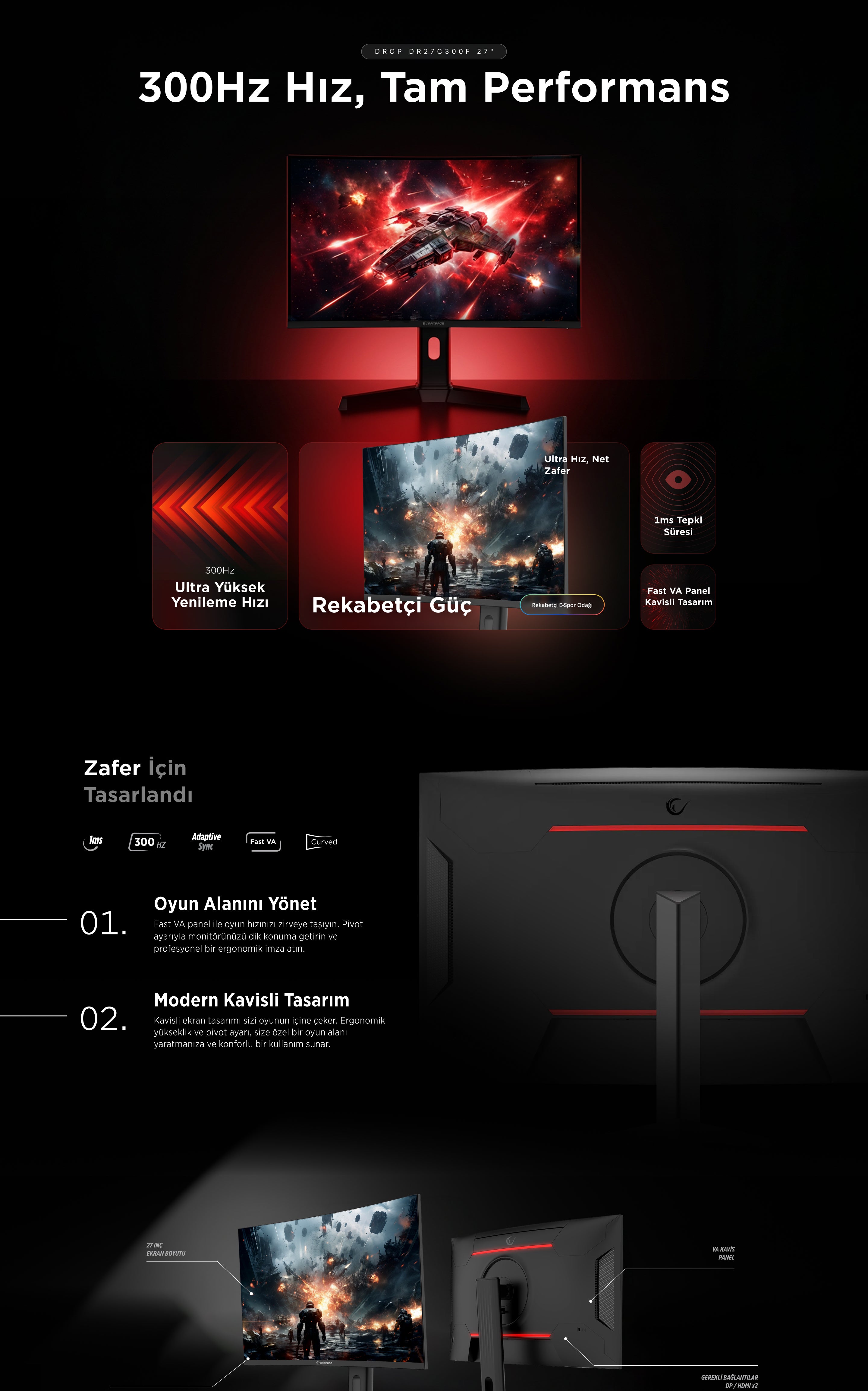 Drop DR27C300F 27'' 300Hz Fast VA FHD Freesync/Gsync RGB Pivot R1500 Curved Gaming Monitor