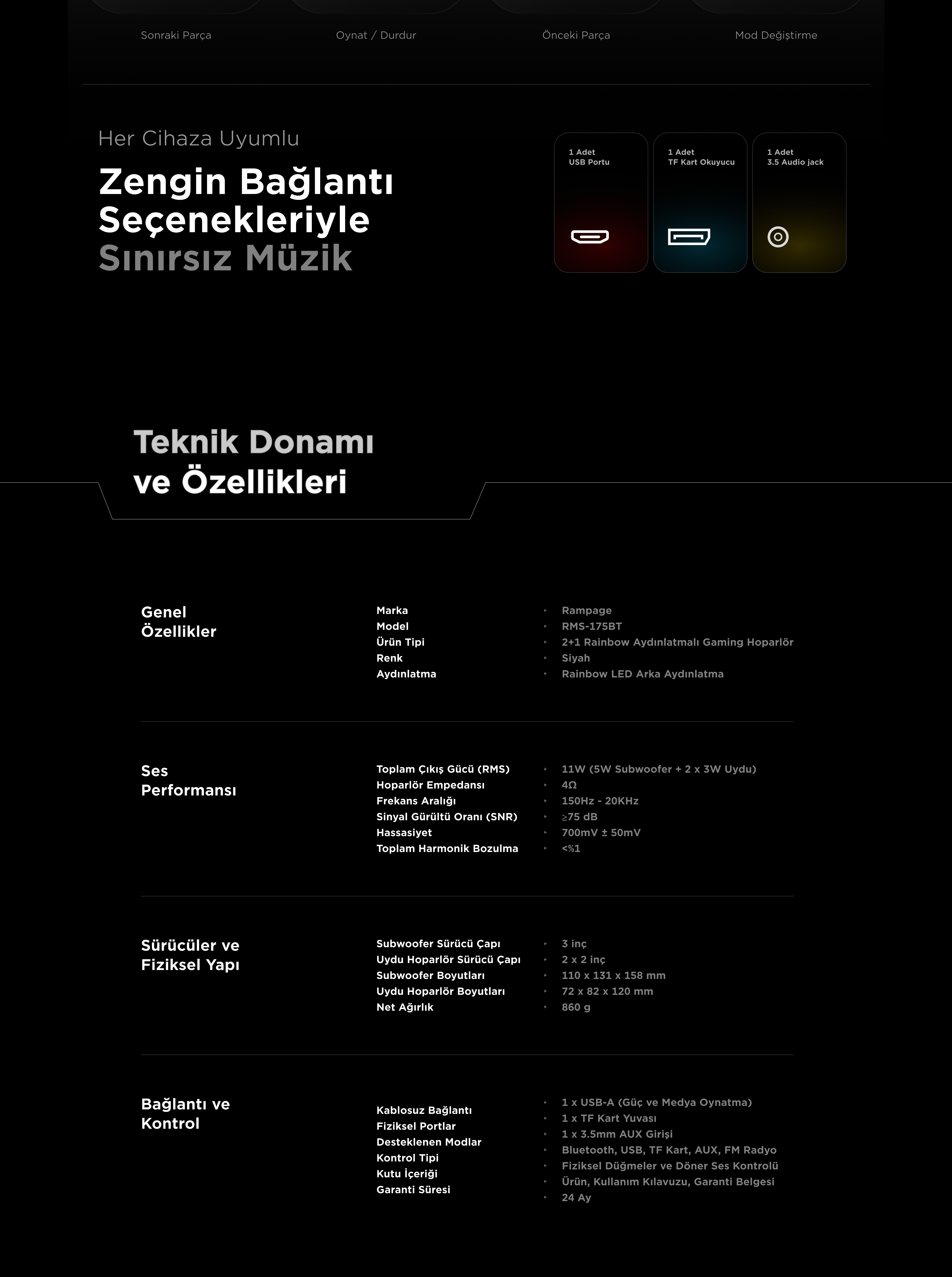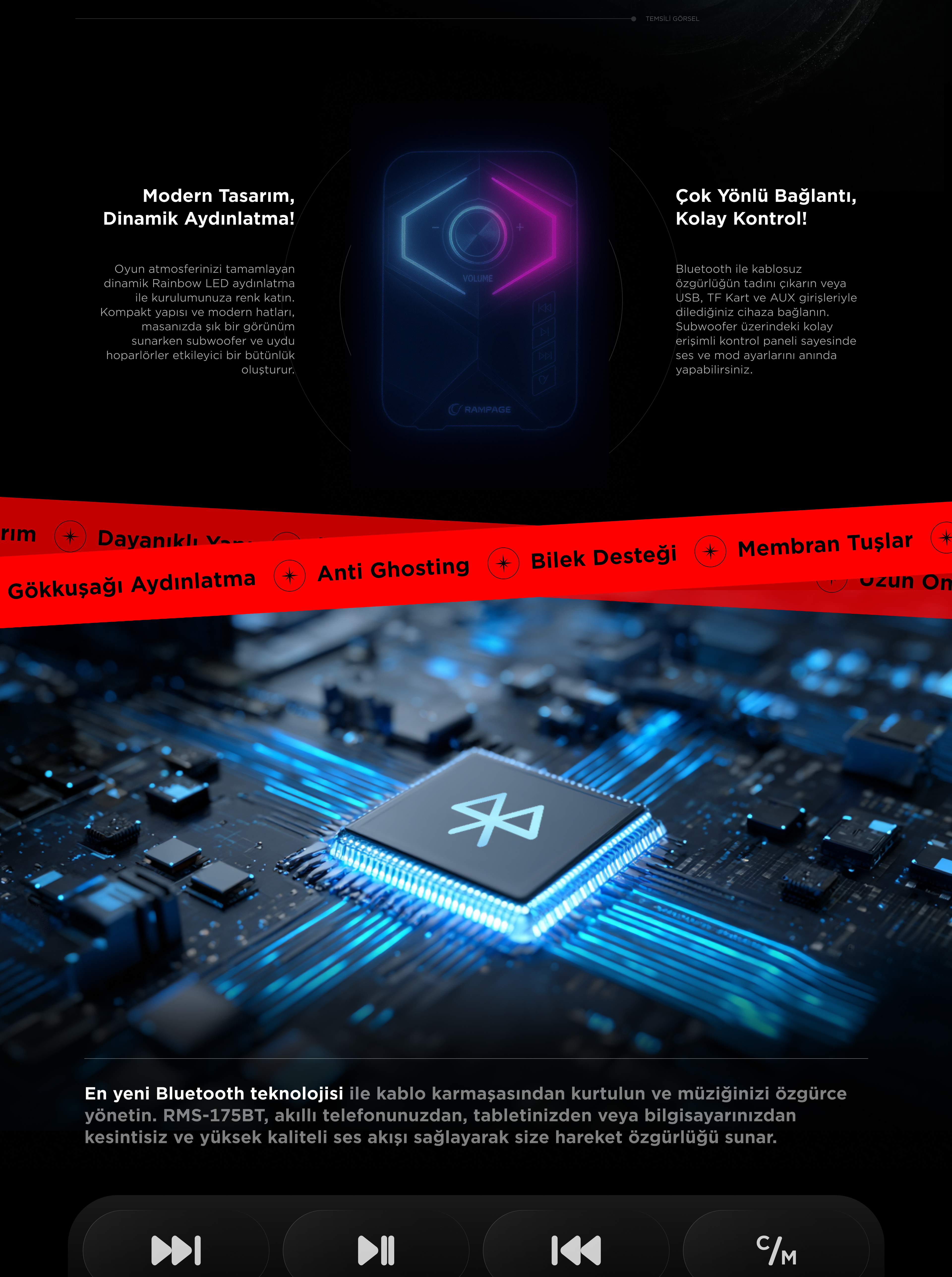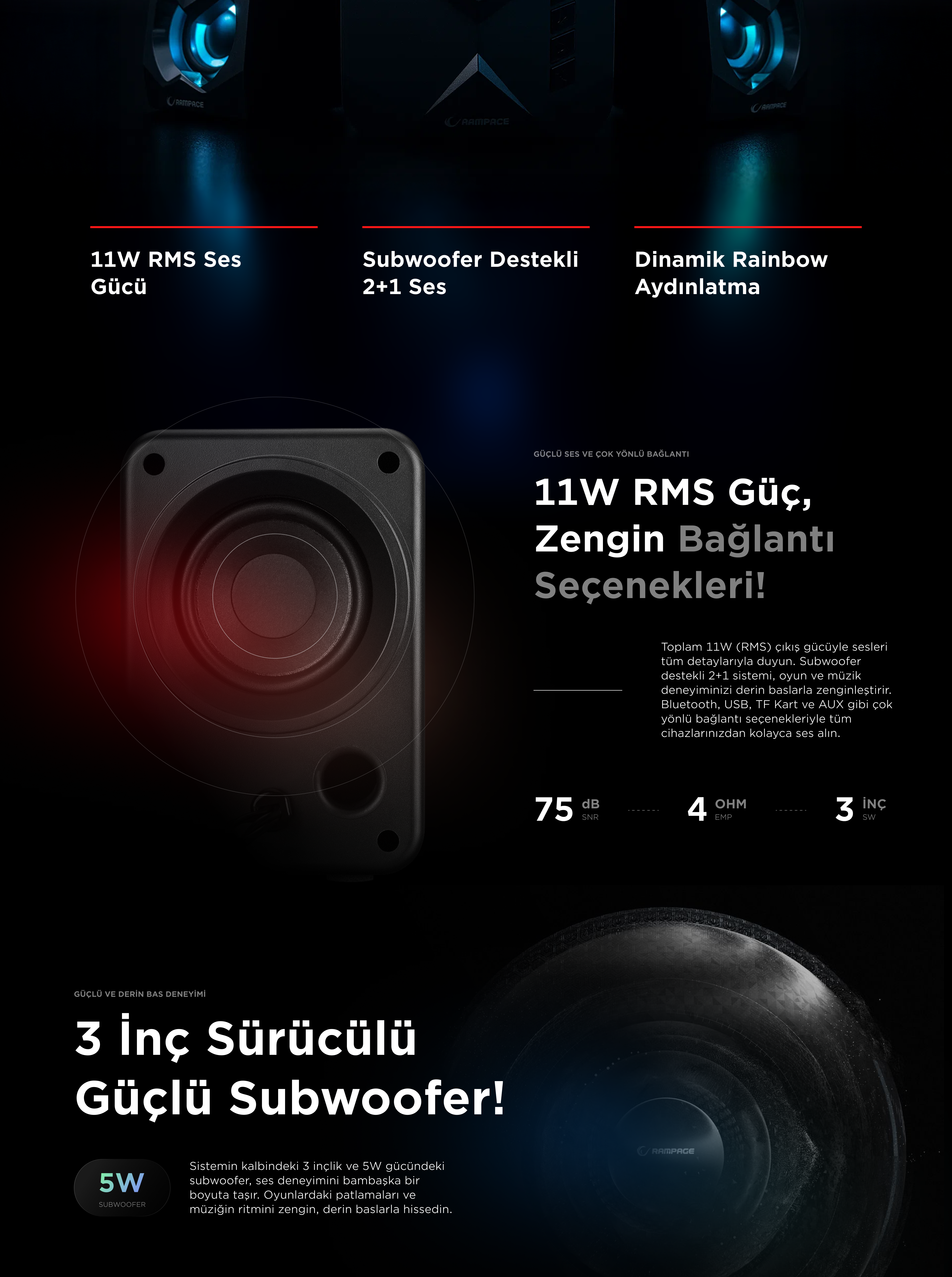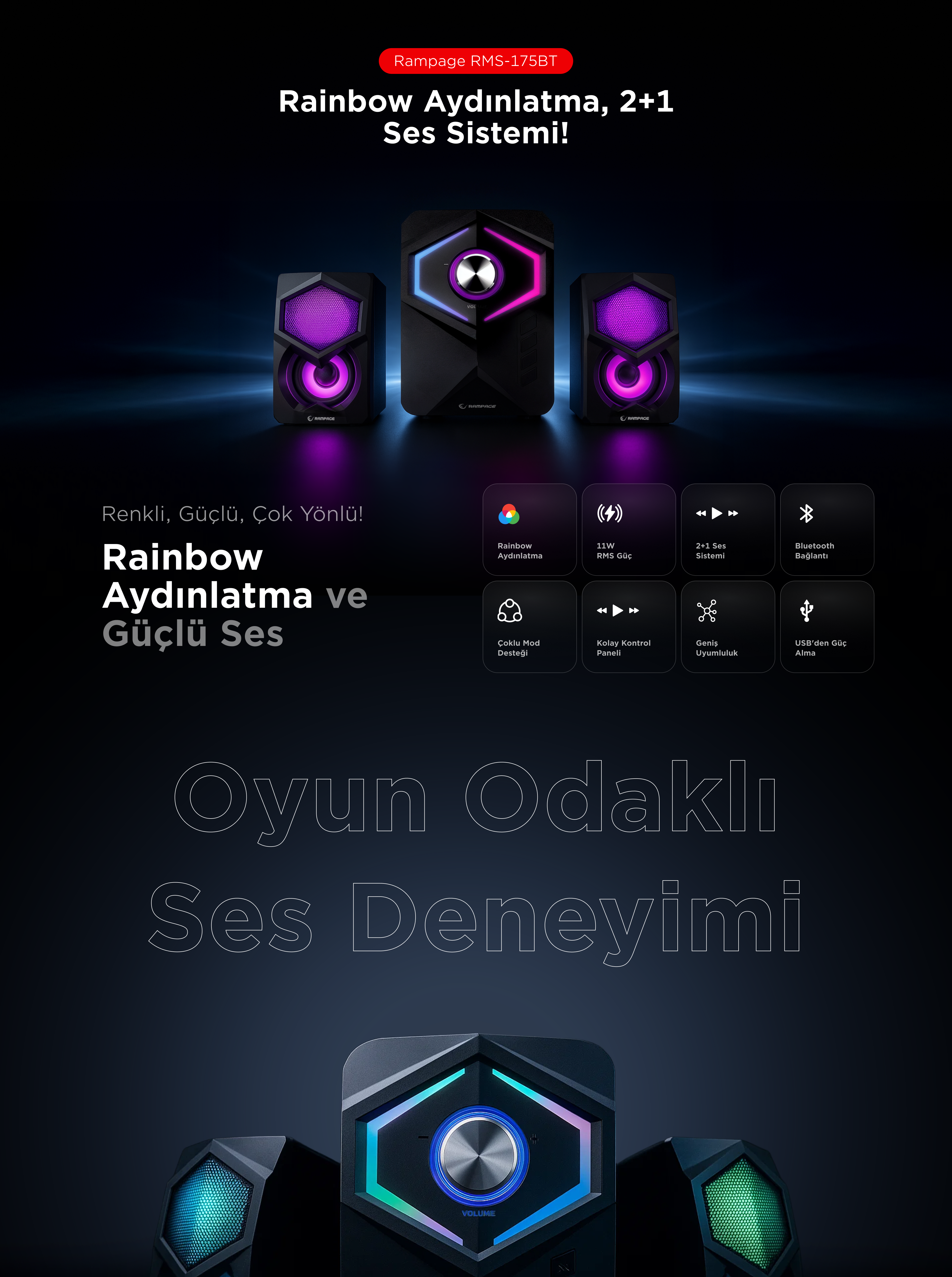 Rms-175BT 2+1 2x5W Bluetooth+Usb-TF-FM Rainbow Player Speaker
