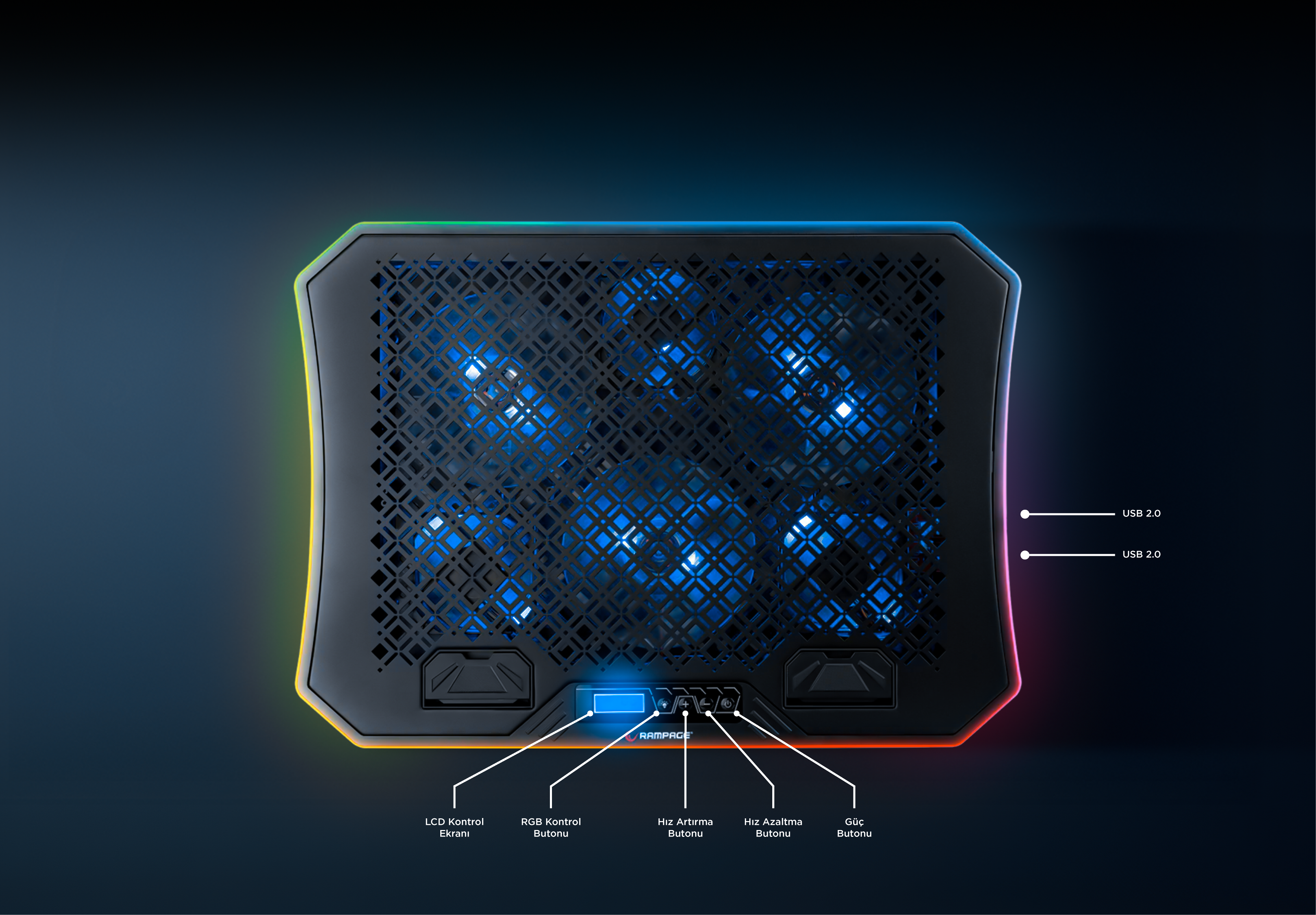 Rampage METAFOR’un 2 adet USB 2.0 girişi ve LCD kontrol panelindeki fan hızı artırma, azaltma, RGB kontrol butonu ile kolay ve hızlı kontrol sağlayın.