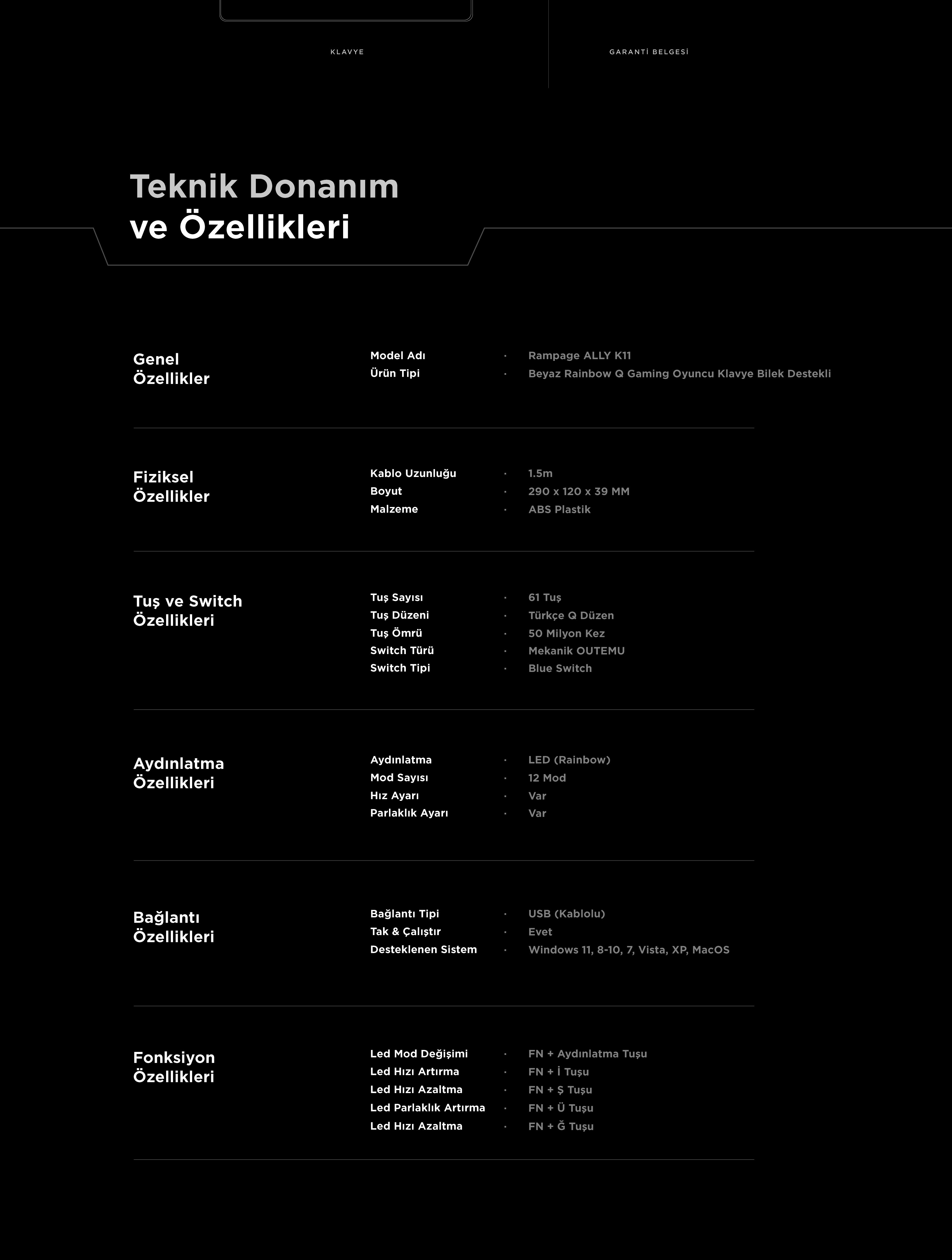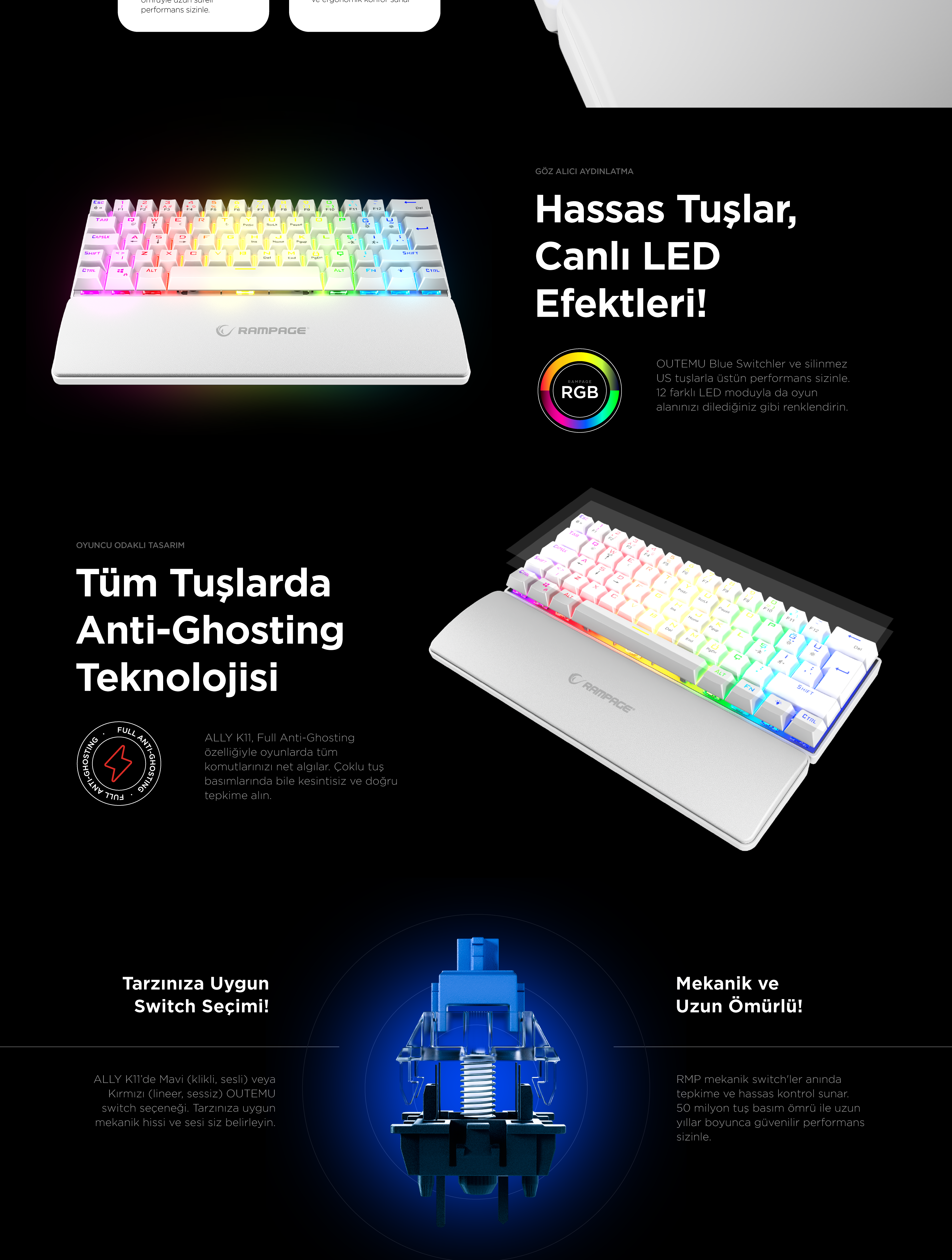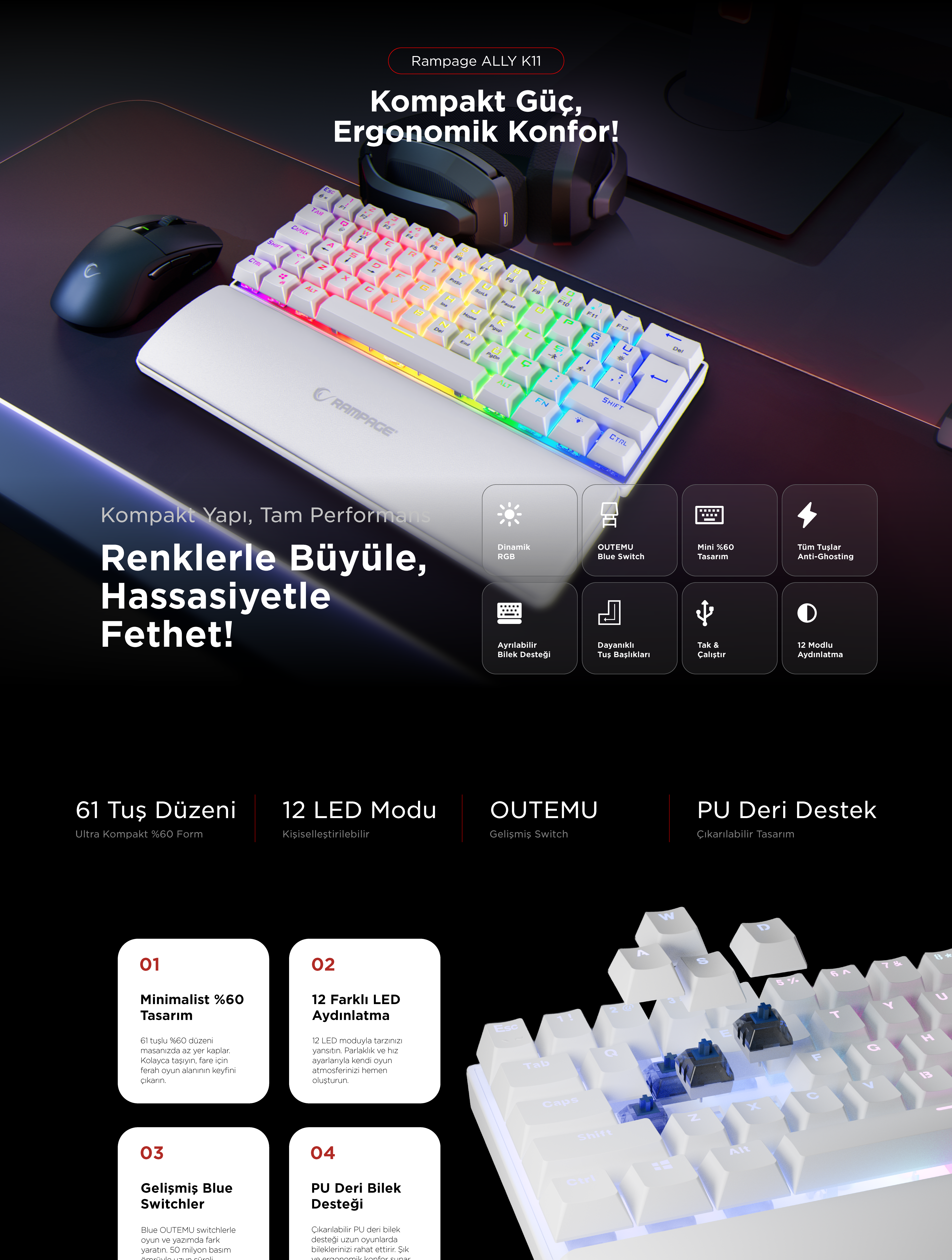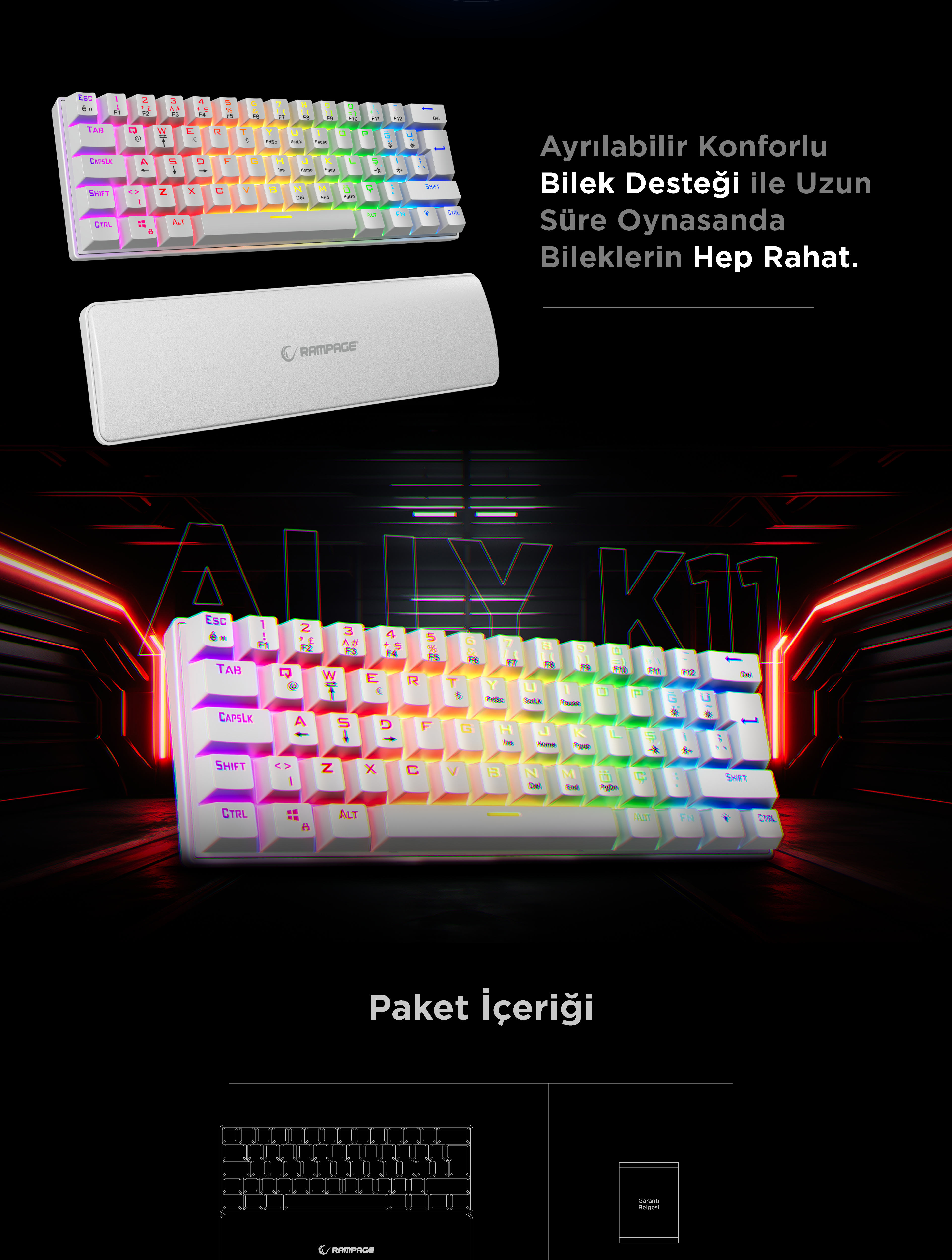 Rainbow Bilek Destekli Blue Switch Oyuncu Klavyesi-Beyaz