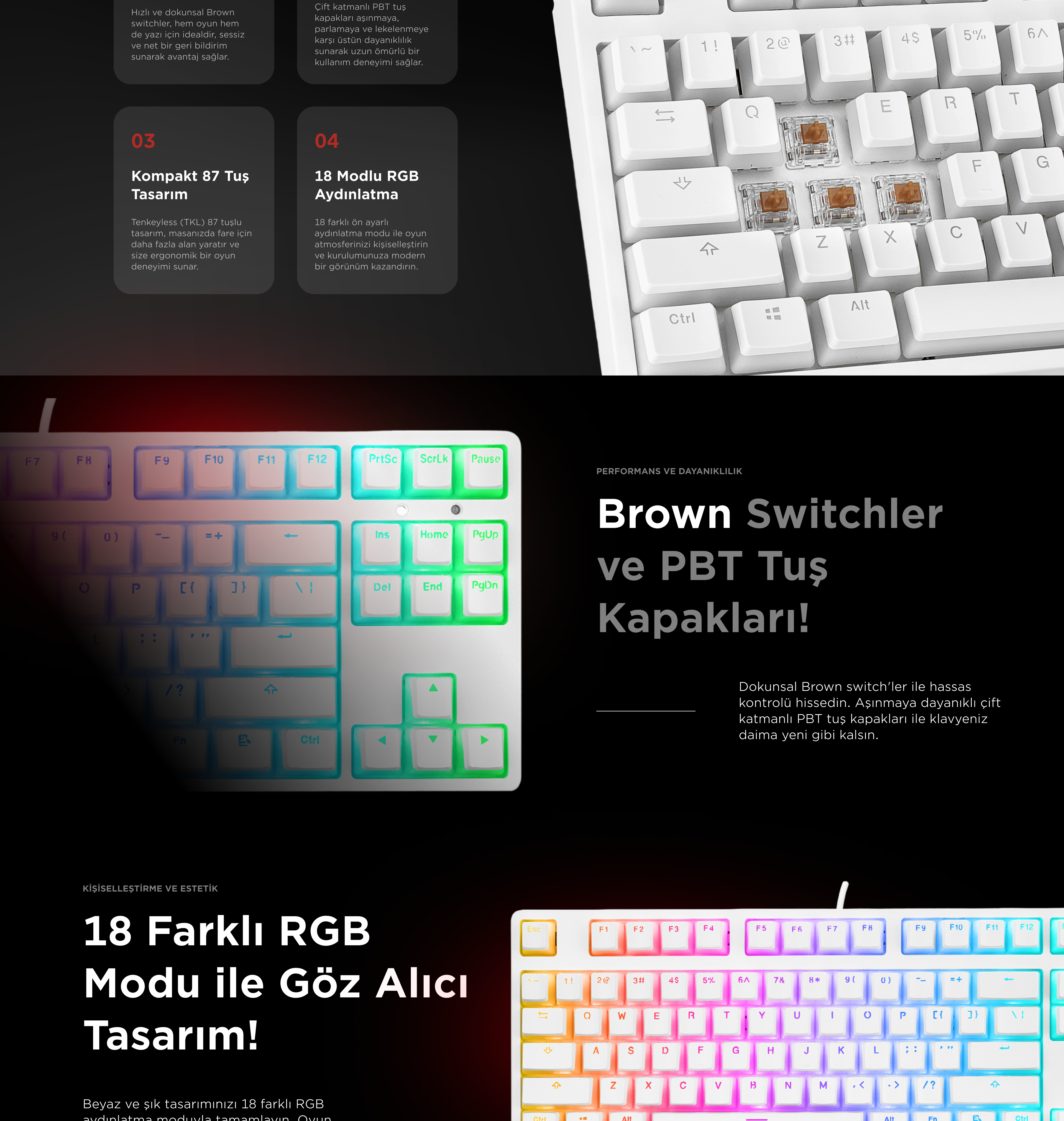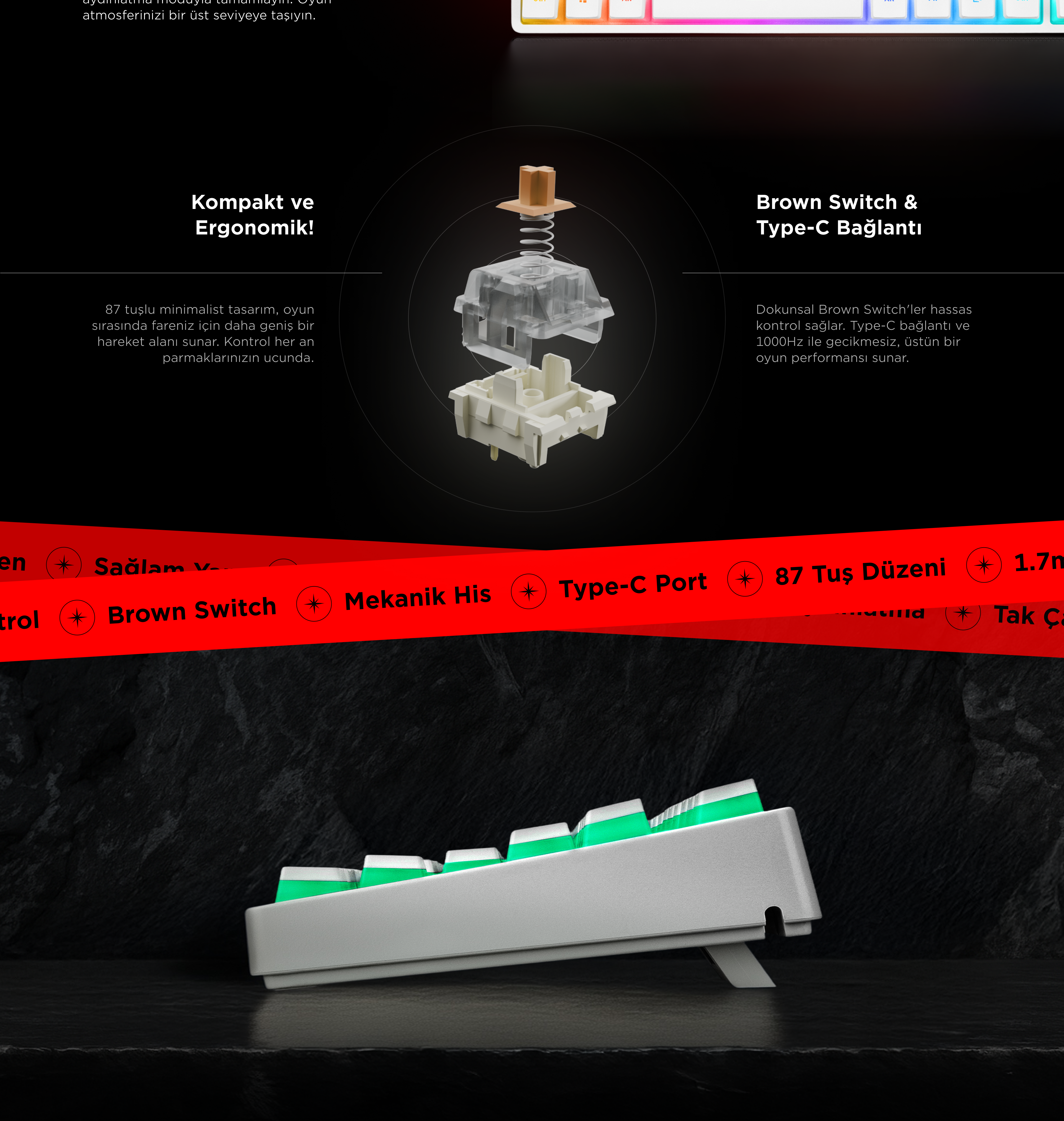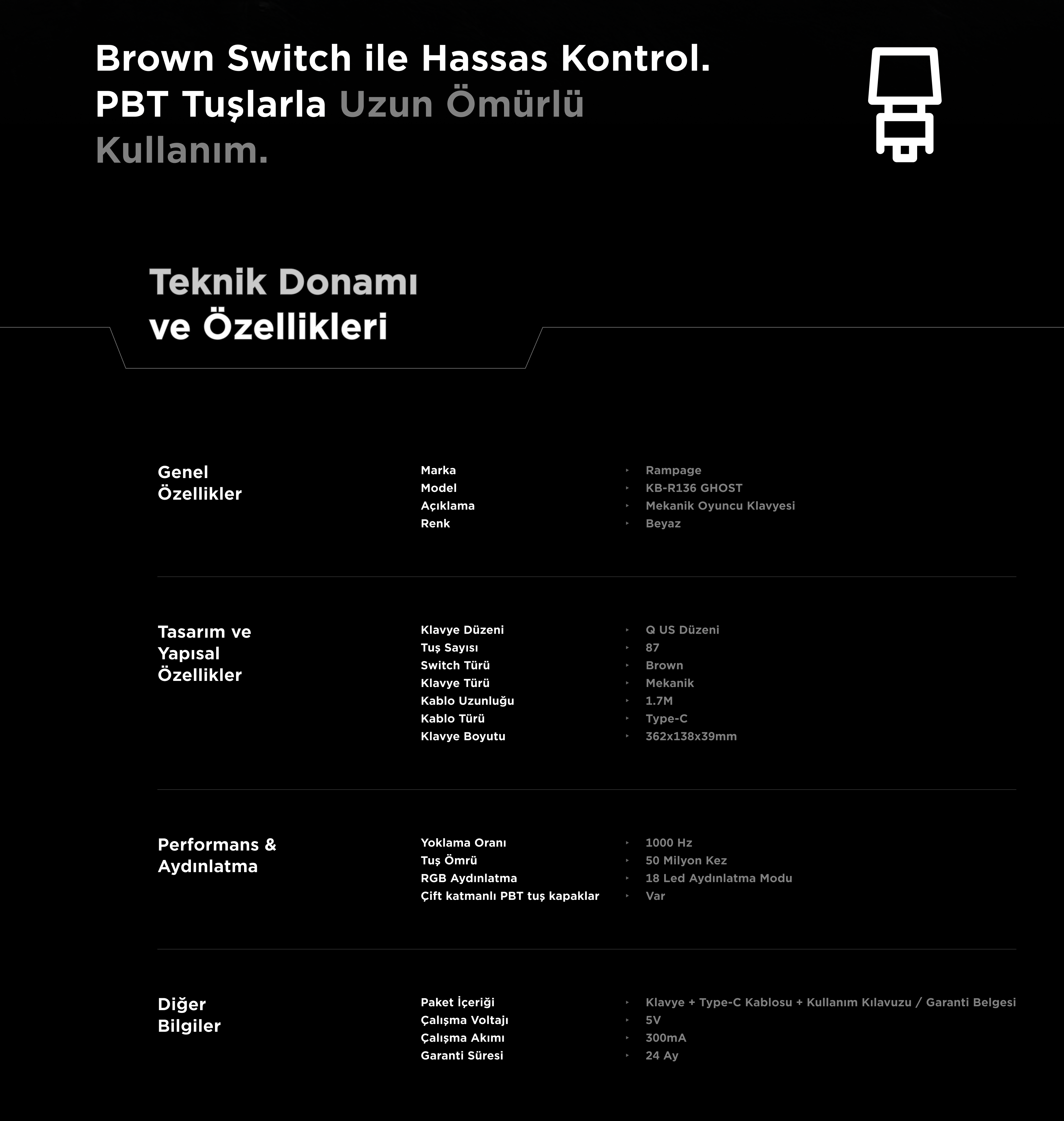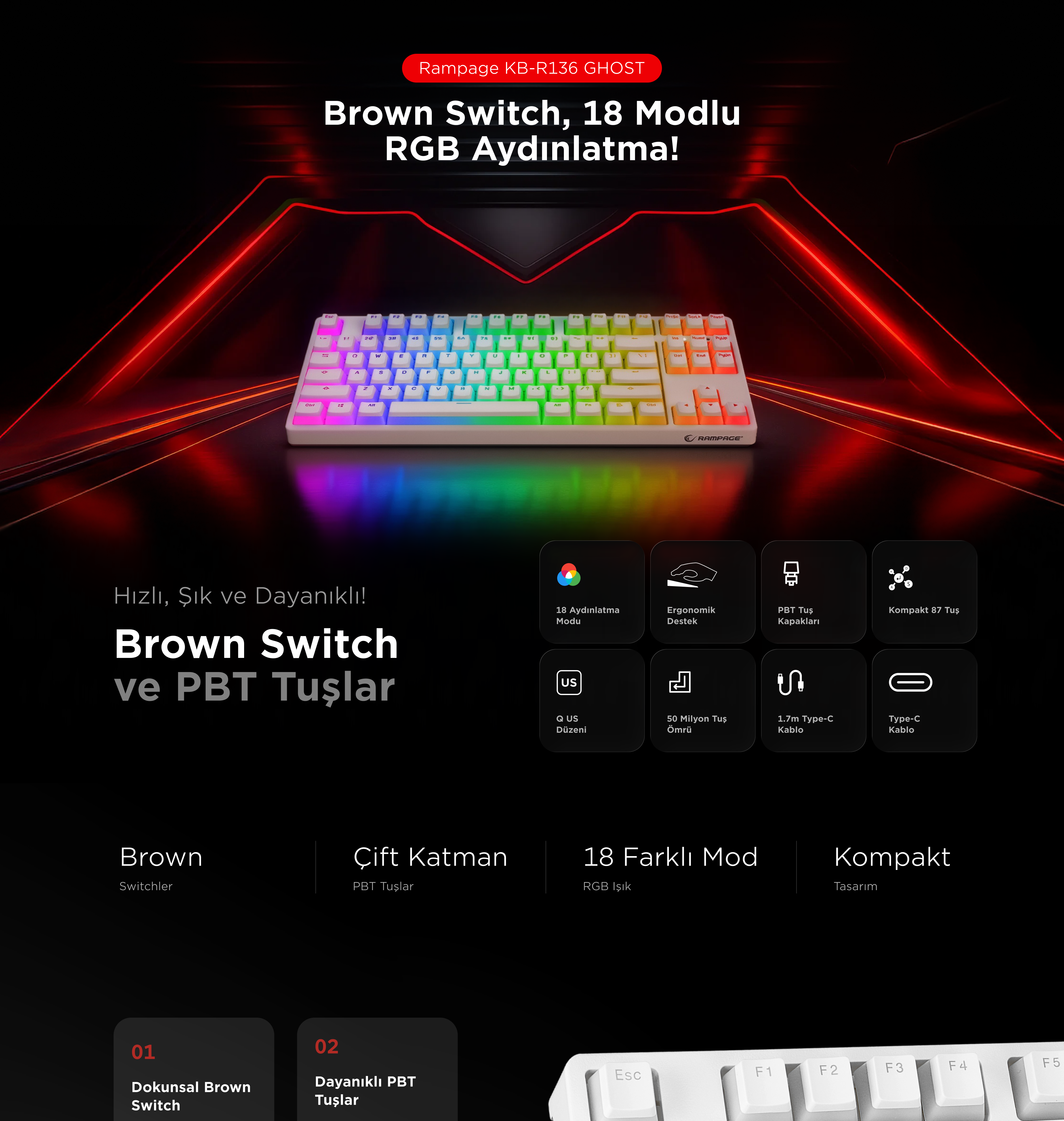KB-R136 GHOST Beyaz Type-C Bağlantılı RGB Puding Tuşlu Brown Switch US Gaming Oyuncu Klavye