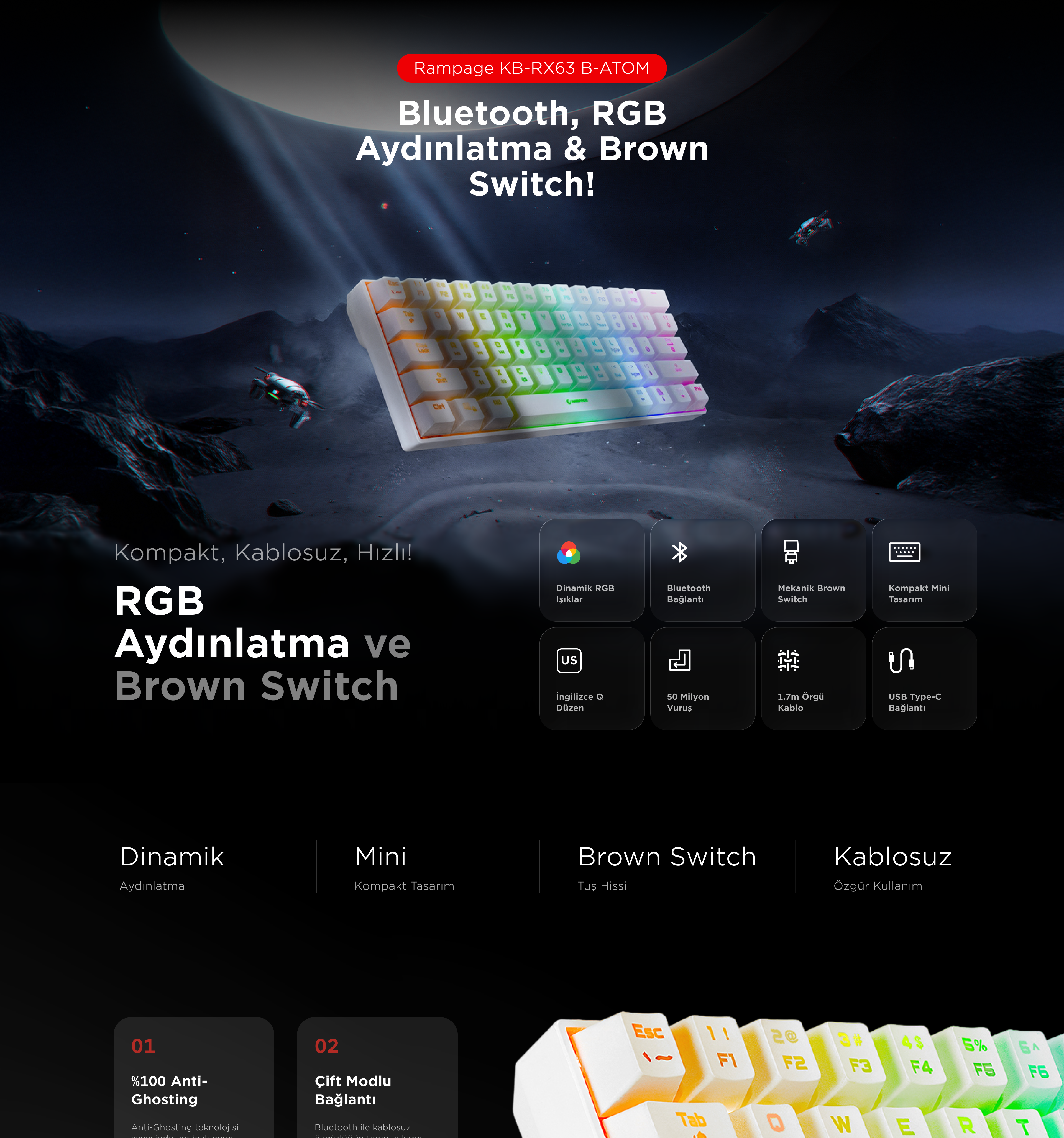 Kb-Rx63 B-Atom Bluetooth Brown Switch Q 63 Tuşlu US Layout Mekanik Oyuncu Klavyesi-Beyaz