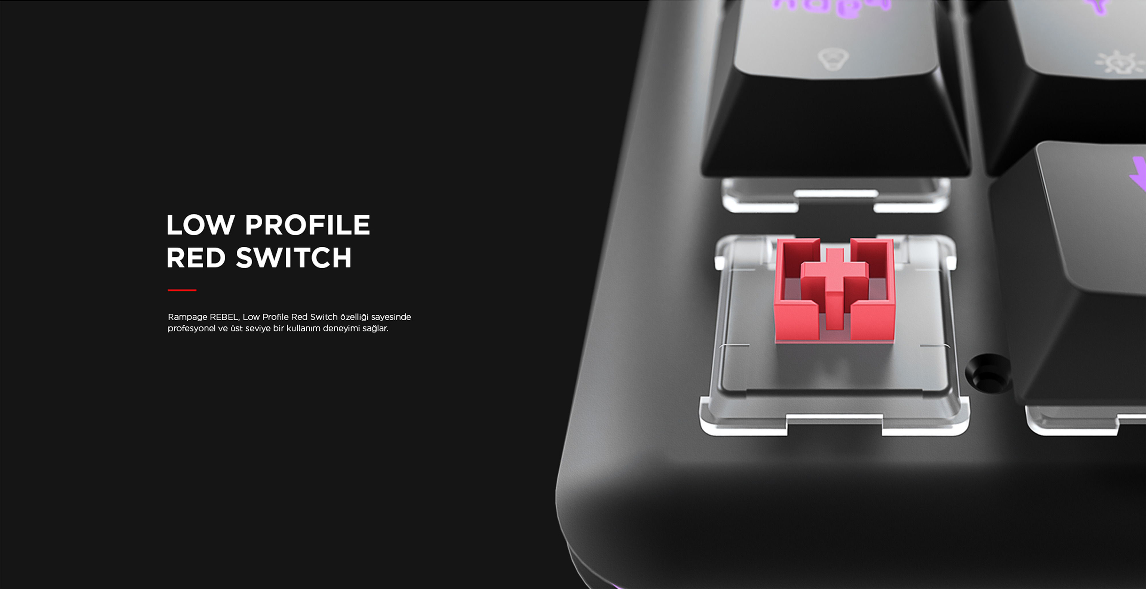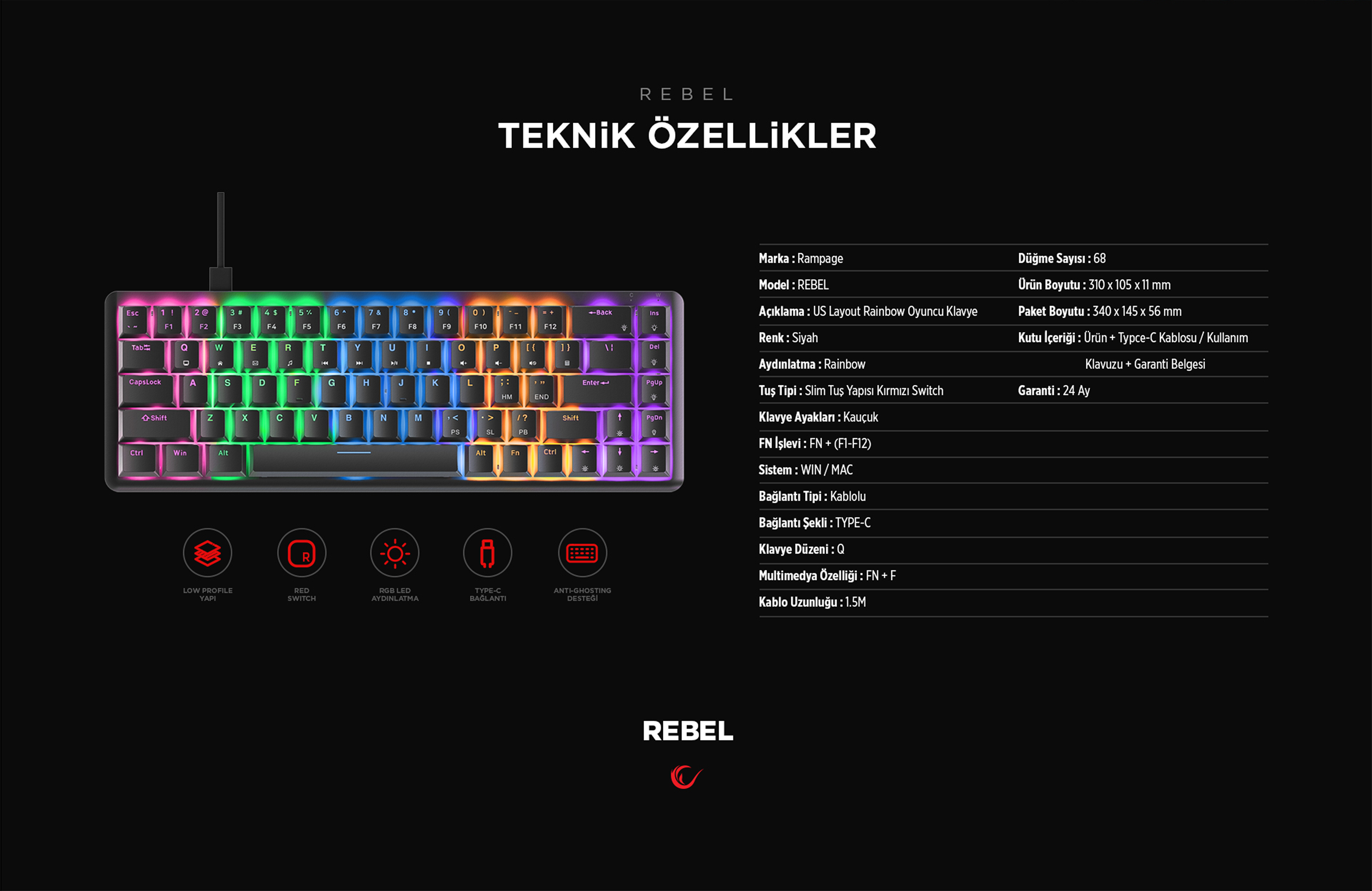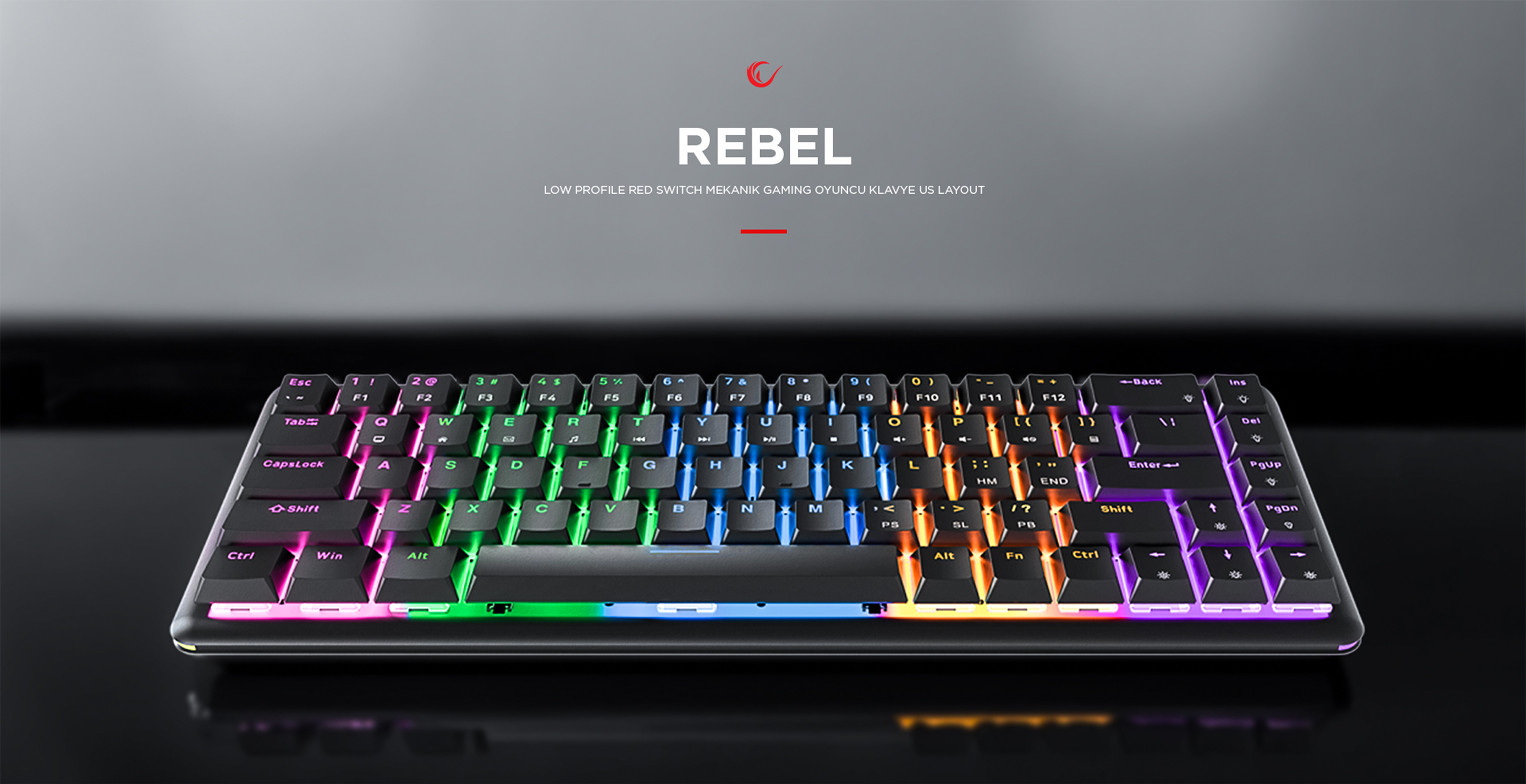 Rebel Low Profile Rainbow US Layout Red Switch Mekanik Oyuncu Klavyesi-Siyah