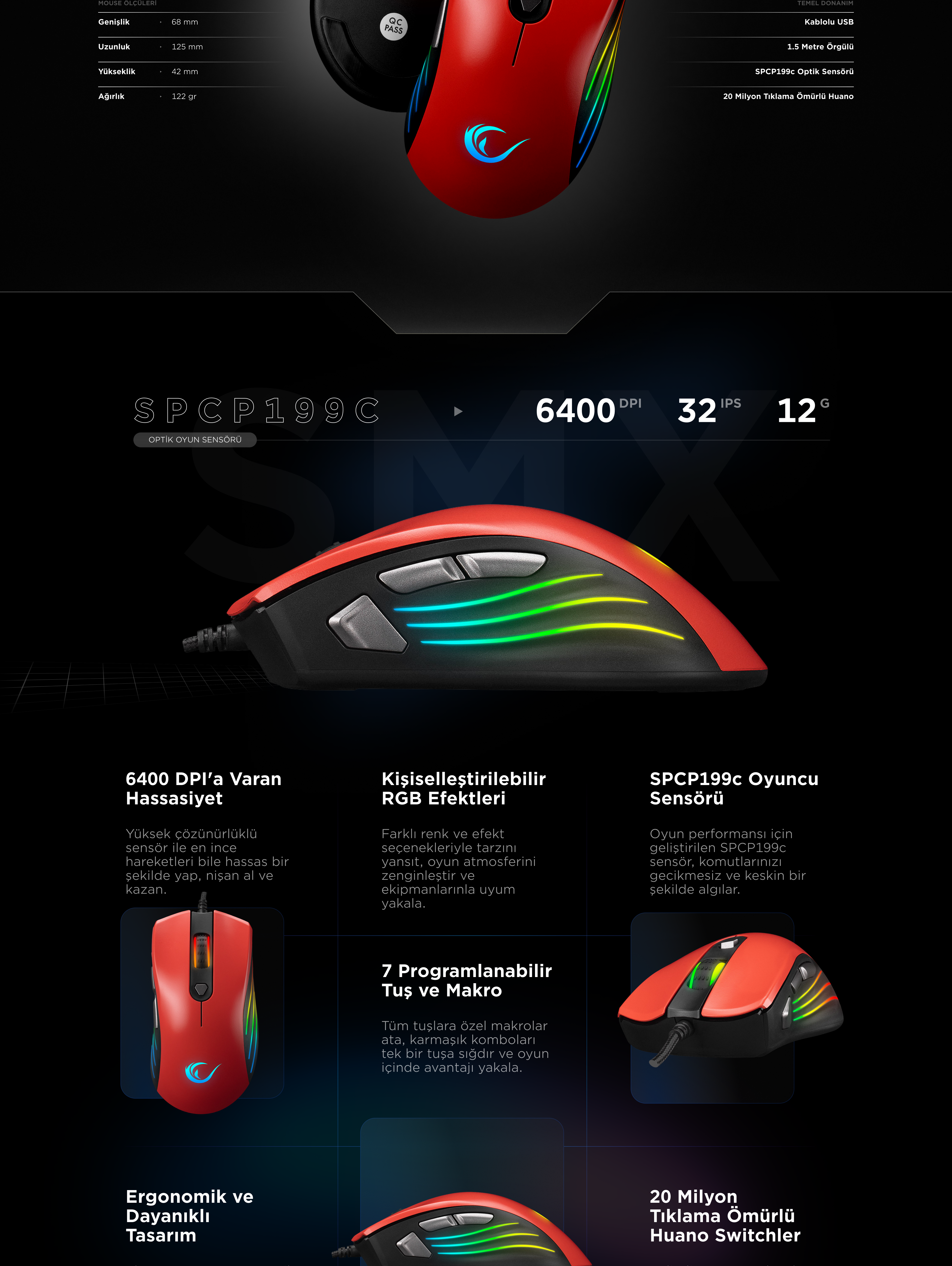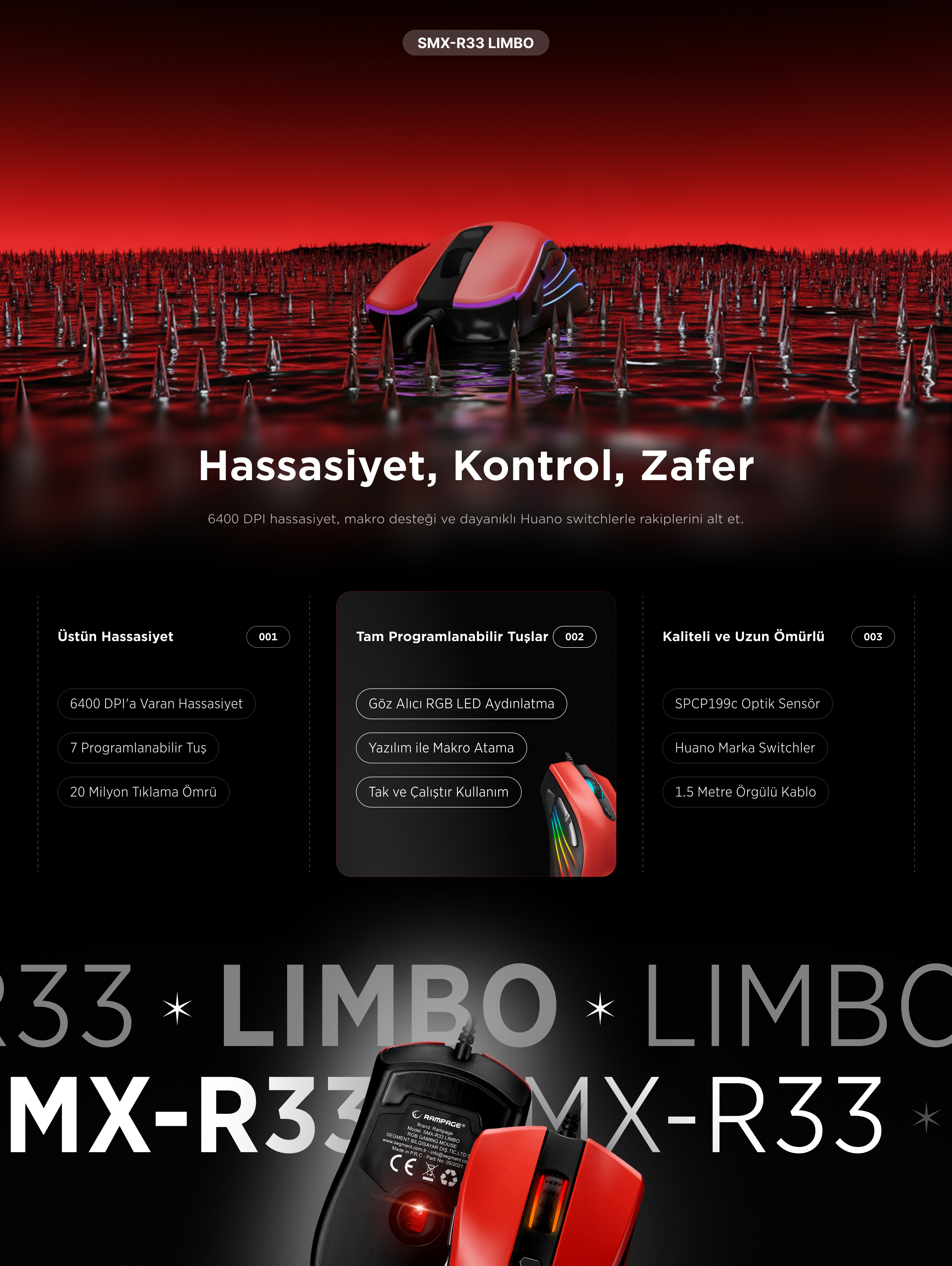 Smx-R33 Limbo RGB 6400 Dpi Makrolu Oyuncu Mouse Siyah/Kırmızı