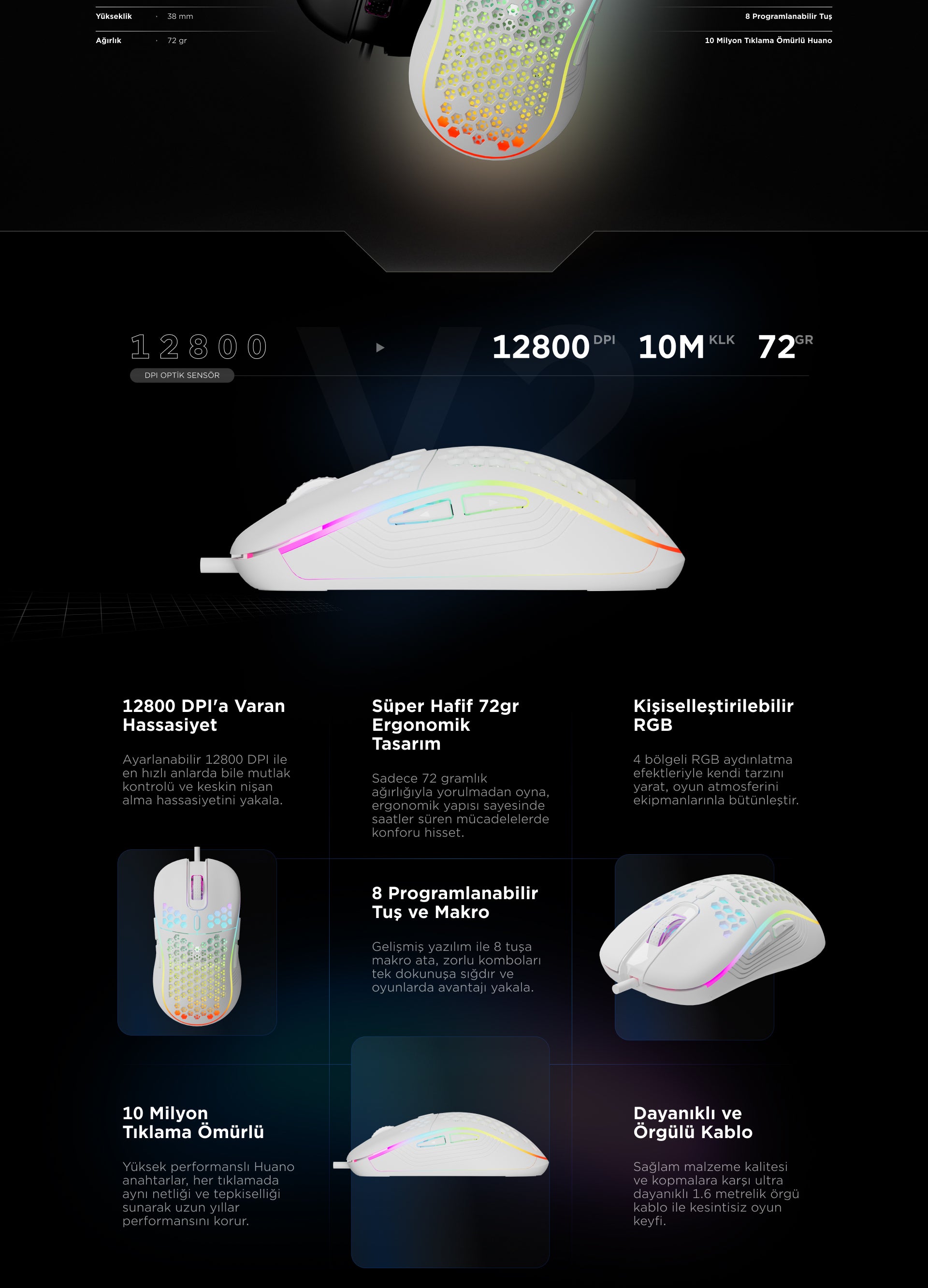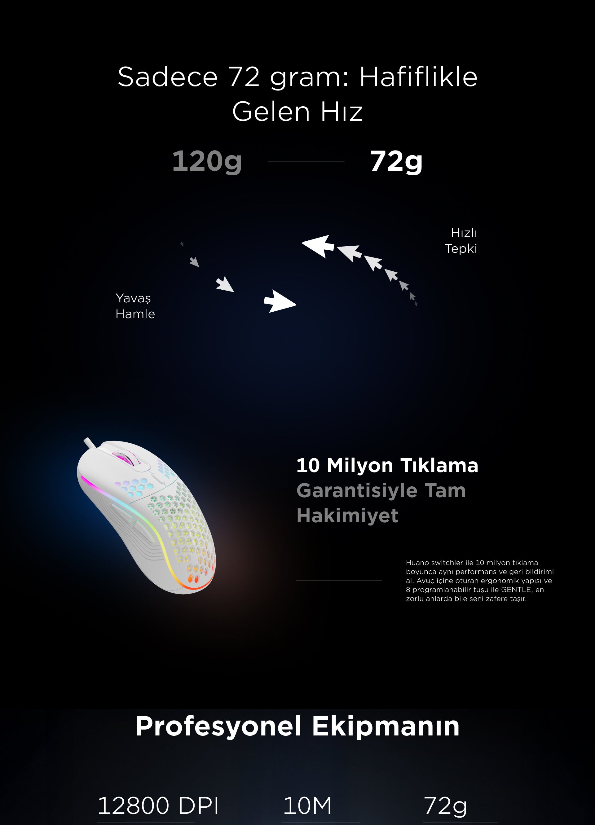 Smx-R85 Gentle 12800 Dpi RGB Süper Hafif Makrolu Oyuncu Mouse-Beyaz